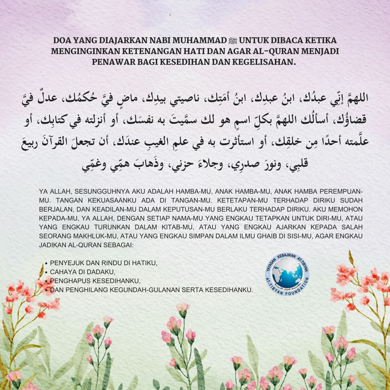 Doa ni cantik sebab mengingatkan kita bahawa segala ujian dan kesedihan boleh dilepaskan dengan mendekatkan diri kepada Allah dan menjadikan al-Quran sebagai rujukan hati.
